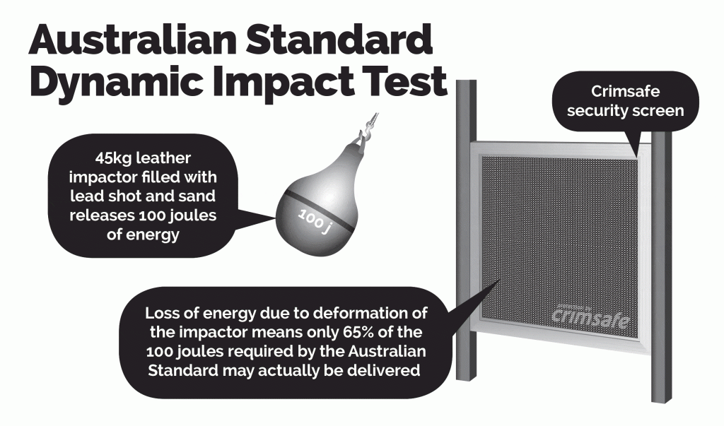 The Australian Standard (AS5041-2003), sets out requirements for a ‘Dynamic Impact Test’. This simulates the effect of a human impact against a security screen and is measured in ‘Joules’ (a unit of energy).