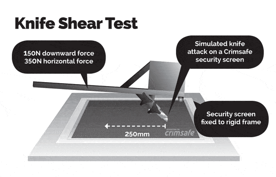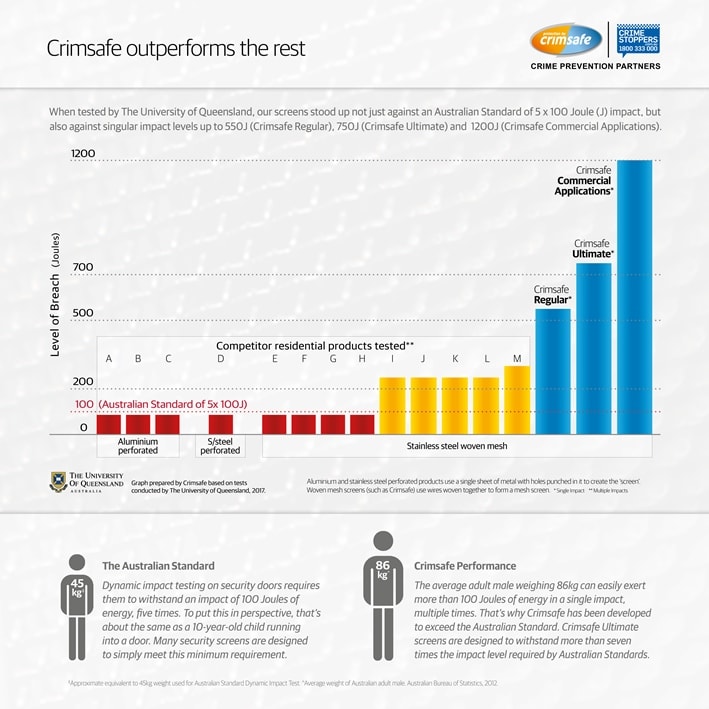 Crimsafe withstood the multiple impacts required by Australian Standards, and withstood a single impact of 550 Joules (Crimsafe Regular), 750 Joules (Crimsafe Ultimate) and 1200 Joules (Crimsafe Commercial Applications).