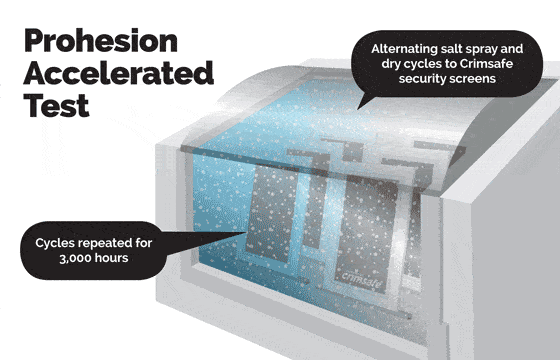 Prohesion tests use a method of cyclic accelerated corrosion and are designed to evaluate how well the surface coatings of the Crimsafe screen protect from corrosion.