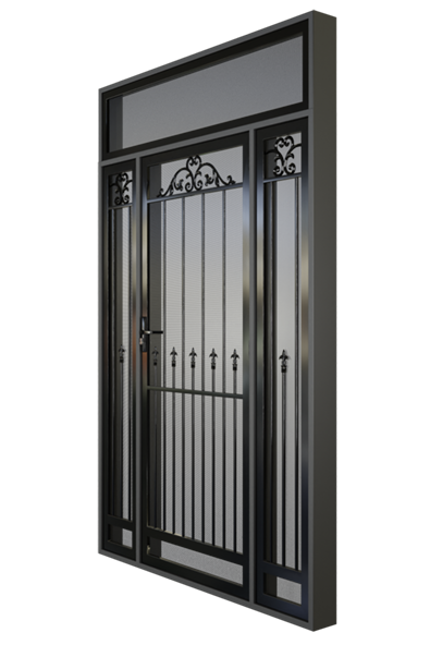 The Balwyn steel porch enclosure is topped with a wrought iron scroll accented with a leaf pattern. As the design moves downwards sleek bars are interspersed with a classic spearhead design. Compliment your picket fence with this design to make your front yard pop.