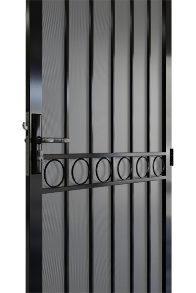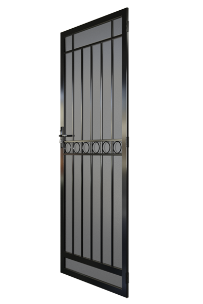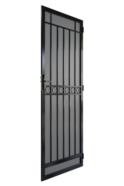 A basic security door's design relies on the stark lines of its steel bars. The Carnegie uses its circular elements to soften the design and give it a central focal point. Making it a great choice for a simple design that still adds some character to the facade.