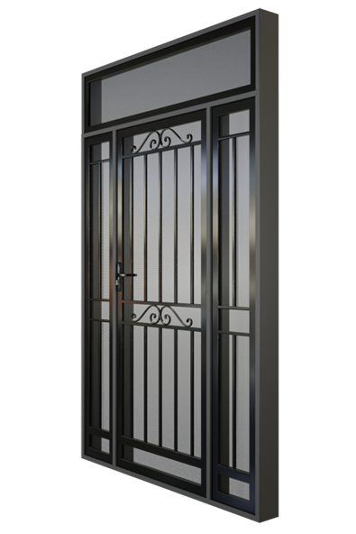 If wanting to accent the vertical profile of your front entrance the Kooyong is a great choice. The vertical bars pull the eye upwards from scroll accent to scroll accent. The positioning of the scrolls atop the door accent the curvature of the roof above it and create a clear entryway.