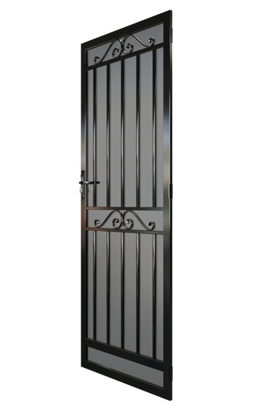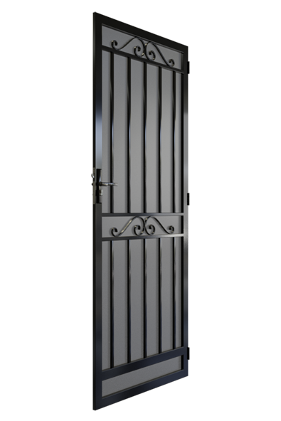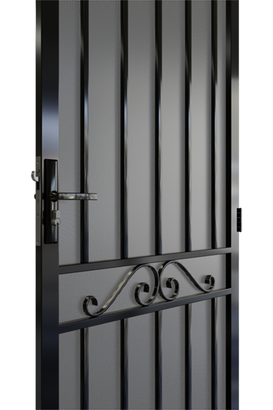 If wanting to accent the vertical profile of your front entrance the Kooyong is a great choice. The vertical bars pull the eye upwards from scroll accent to scroll accent. The positioning of the scrolls atop the door accent the curvature of the roof above it and create a clear entryway.