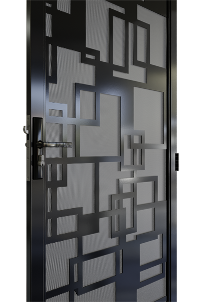 The Templestowe is a laser cut security door celebrating bold and innovative design. The illusion of a 3D effect is created through the layered boxes as they zig zag from left to right