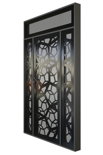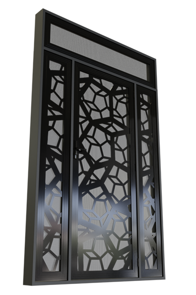 The layers of the Vortex porch enclosure interlock differing sizes of pentagons to create a beautiful hive pattern in front of the Crimsafe mesh. This creation of depth allows the eye to be drawn across the whole design while maintaining privacy for those behind the door.