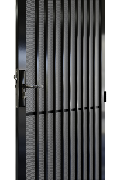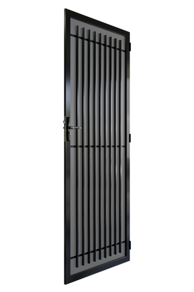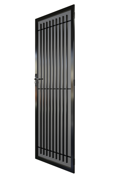 Created with a minimalist design criteria in mind this super cool design will totally transform anyone's home. The particular spacing of the clean vertical lines creates a 3D effect that most security doors lack. This door will draw the eye and make a statement while still maintaining that minimalist presence.