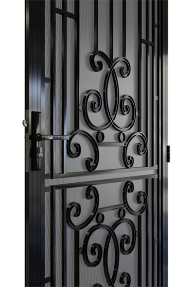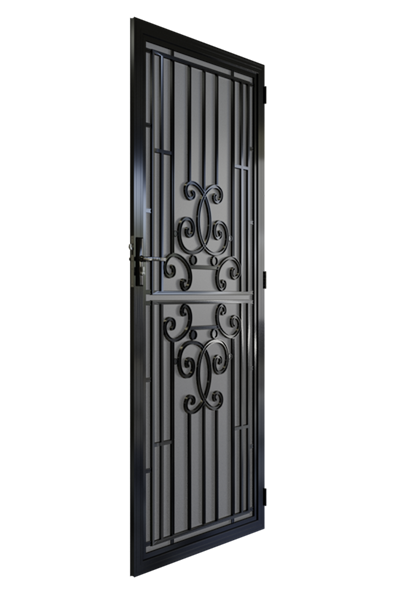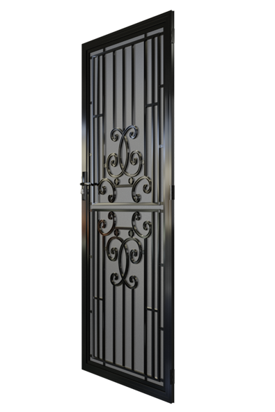 The Whittlesea aluminium security door design is a beautiful addition to any timber stained front door. The classically set vertical bars supply strong security which is then offset beautifully by the central symmetrical scrolls. The wrought iron look allows for this door to suit a variety of homes, both traditional and contemporary.